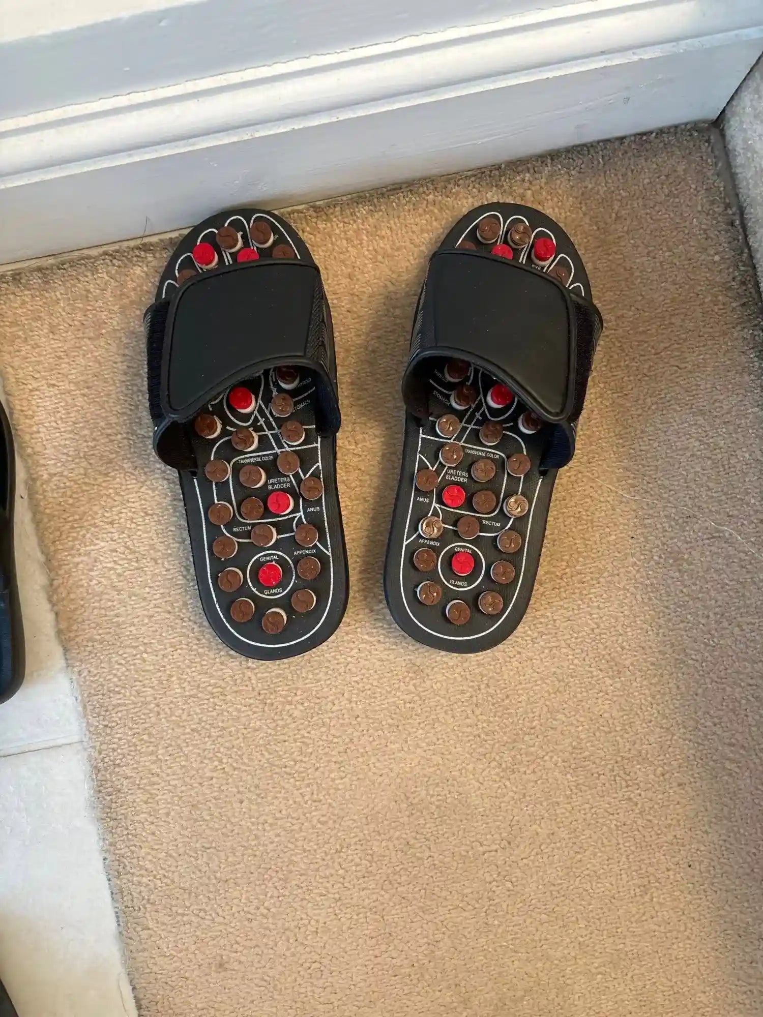 The slippers use acupressure nodes that target specific points on your feet to stimulate blood circulation and relieve pain, providing a soothing sensation and faster recovery.